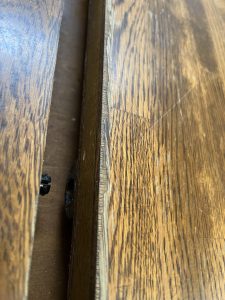 オークの集成材突板です。ところどころ、欠損や浮きがみられますが幸い箇所数は限られるので補修は十分可能です。