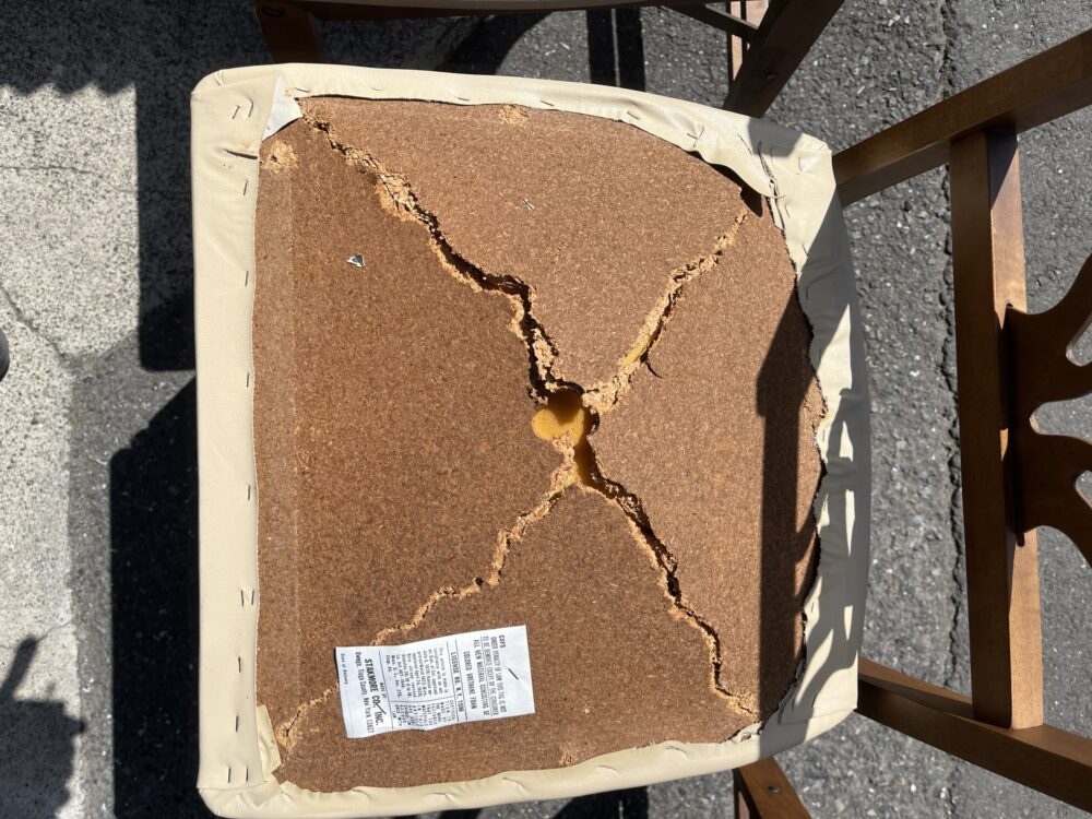 もう一枚は破損まではいかなくとも、亀裂が入っています。張り直してもすぐにもう一枚の座面のように、破損してしまうでしょう。